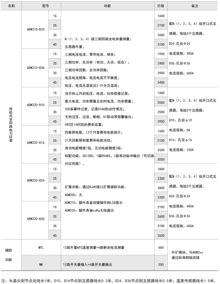 ADW2xx系列導軌式多回路電力儀表主要用于低壓三相回路全電參量測量,同時可選擇四個回路的電流輸入。可直接或間接測量電壓、電流、功率、功率因數、相角、不平衡度、諧波等參數。 還可通過其RJ45接口擴展輔助功能,實現DI、DO、測溫、剩余電流測量,以及2G、4G、LoRa、LoRaWan、NB-Lot無線通信功能。