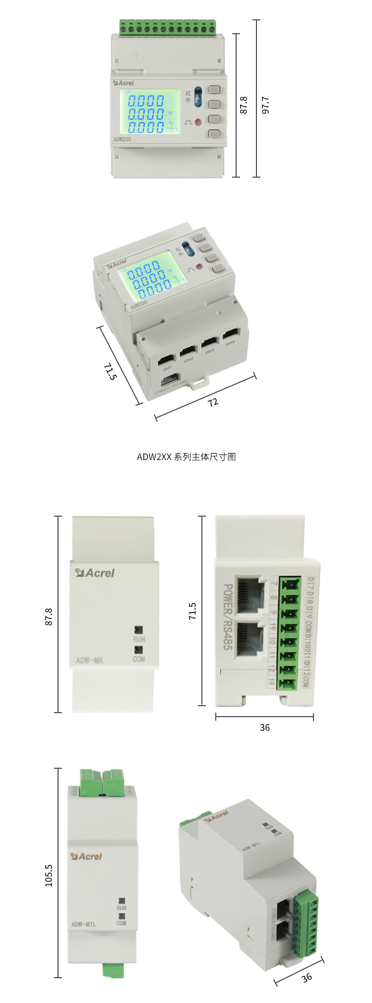 ADW2xx系列導軌式多回路電力儀表方便用戶進行用電監測、集抄和管理。可靈活安裝于配電箱內,實現對不同區域和不同負荷的分項電能計量,統計和分析。