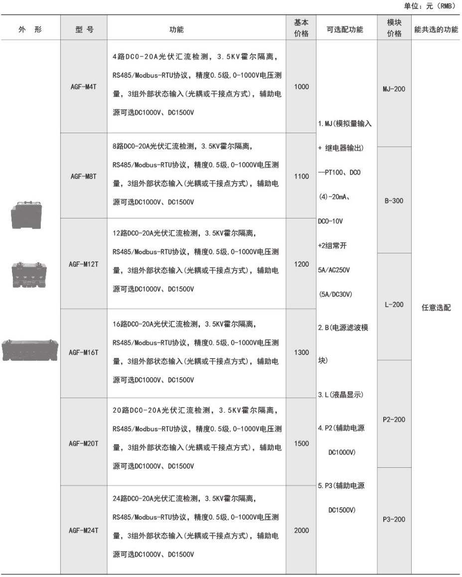 AGF-T穿孔式光伏匯流采集裝置是專門應用于智能光伏匯流箱,用于監測光電池陣列中電池板運行狀態,組串電流測量,匯流箱中防雷器狀態采集、直流斷路器狀態采集、裝置帶有RS485接口可以把測量和采集到的數據和設備狀態上傳。