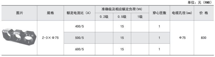 | 規格 | 額定電流比 | 準確級及相應額定負荷(VA) | 電纜孔徑 | 安裝方式 | ||