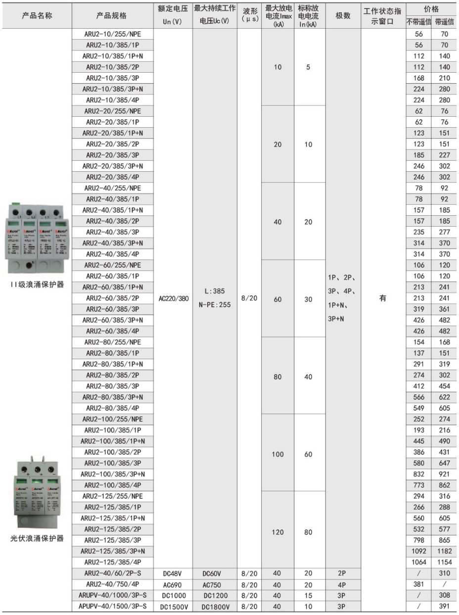 安科瑞ARU系列浪涌保護器是一種為各種電子設備、儀器儀表、通訊線路、低壓電氣線路提供安全防護的電子裝置。適用于交流50/60Hz,額定電壓380V的供電系統或光伏系統,對間接雷電和直接雷電影響或其他瞬時過電壓的電涌進行保護。
